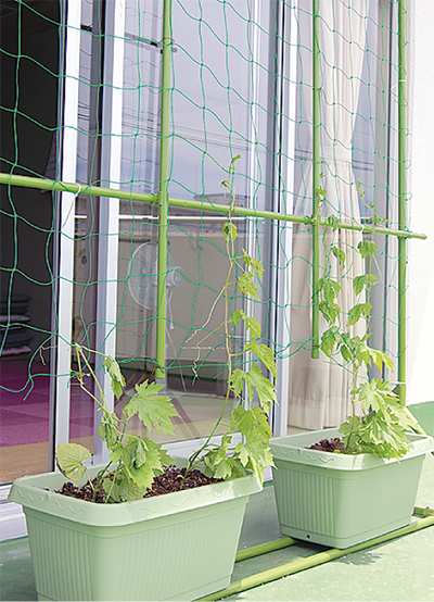 テラスの窓際に設置したプランターに4つの苗を植えた梶ヶ谷いこいの家(高津区)では「お年寄りが多く集まるので特に暑さ対策に期待しています。利用者の方々と一緒に成長を楽しみにしています」と話す。
