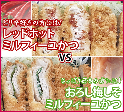 数々のTV・雑誌で話題の人気店「とんかつ&サラダバーよしかつ」では、「ミルフィーユかつ対決」を開催。スパイシーなシーズニングが食欲をそそる「レッドホットミルフィーユかつ」VS梅肉としそを挟み、さっぱりとした味わいの「おろし梅しそミルフィーユかつ」から目が離せない。