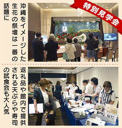見学会では生前沖縄が好きだった女性の葬儀をモチーフに祭壇を表現。色鮮やかな生花が壇上を飾り、来館者からは「明るくてキレイ!」「葬儀も昔とだいぶ変わったのね」と評判を呼んでいた。個別相談会では葬儀の段取りや価格などの質問が多く寄せられ、関心の高さを伺わせた。