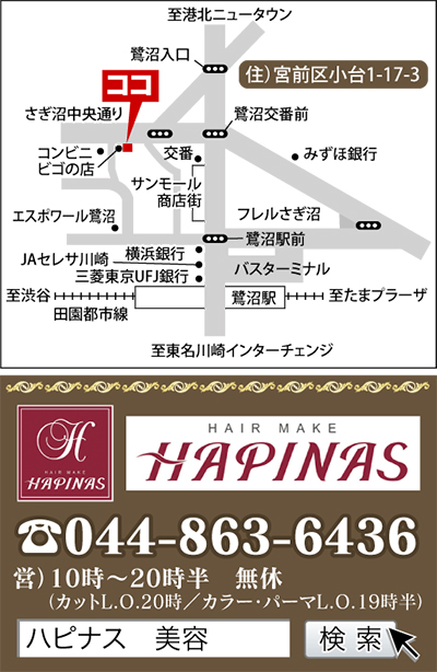 鷺沼駅徒歩3分の場所にオープンした美容院「HAPINAS」。一歩店内に入ると、中は白を基調とした明るい内装に緑が映える癒しの空間。気さくで明るいスタッフが迎えてくれる。