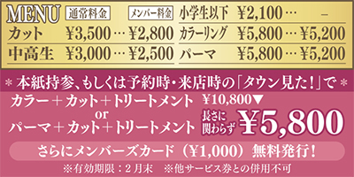 こんな上質の美容院で、料金はカット2800円(メンバー料金)など超リーズナブル。さらに今なら、カラーもしくはパーマにカット・トリートメントとのセットで通常1万800円のところ5800円のオープニングキャンペーン中!ぜひ一度足を運んでみては。