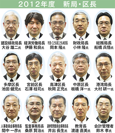 【局長級】総務局長(高津区長)船橋兵悟▽総合企画局長、飛彈良一▽財政局長(監査事務局長)小林隆▽市民・こども局長、山崎茂▽市民・こども局こども本部長(市民・こども局こども本部子育て施策部長)岡本隆▽経済労働局長(経済労働局産業政策部長)伊藤和良▽環境局長、稲垣正▽健康福祉局長、木村実▽まちづくり局長、金子弘▽建設緑政局長(建設緑政局緑政部長)大谷雄二▽港湾局長(財政局財政部長)大村研一▽川崎区長、豊本欽也▽幸区長、森下和子▽中原区長(宮前区副区長)板橋洋一▽高津区長(高津区副区長)秋岡正充▽宮前区長(中原区副区長)石澤桂司▽多摩区長(多摩区副区長)池田健児▽麻生区長、瀧峠雅介▽市民オンブズマン事務局担当理事・事務局長事務取扱、栗山敏子▽会計管理者(人事委員会事務局長)鈴木孝▽交通局長、田巻耕一▽病院局長、三浦政良▽消防局長、福井昭久▽教育長(学校教育部長)渡邊直美▽選挙管理委員会事務局長(選挙管理委員会事務局担当部長選挙課長事務取扱)井出長生▽監査事務局長(幸区副区長)桑原賢治▽人事委員会事務局長(総務局担当理事〈服務監察担当〉)間中一彦▽議会局長、小金井勉▽総務局担当理事・秘書部長事務取扱(総務局秘書部長)土方慎也▽総務局担当理事・危機管理室長事務取扱(市民・こども局市民生活部長)小林哲喜▽財政局担当理事・税務部長事務取扱(財政局税務部長)庄野愼哉▽健康福祉局担当理事・健康安全研究所整備担当(新任)岡部信彦▽健康福祉局担当理事・総務部長事務取扱(総務局人事部長)伊藤弘▽健康福祉局担当理事・市立看護短期大学事務局長事務取扱(健康福祉局総務部長)磯上充▽健康福祉局担当理事・保健医療部長事務取扱(健康福祉局保健医療部長)雨宮文明▽上下水道局担当理事・下水道部長事務取扱(上下水道局下水道部担当部長〈下水道施設担当〉)勝又進▽病院局担当理事・市立川崎病院副院長事務取扱(市立川崎病院副院長)増田純一▽病院局担当理事・市立川崎病院婦人内視鏡科部長事務取扱(市立川崎病院婦人内視鏡科部長)林保良▽教育委員会事務局担当理事・教育環境整備推進室長事務取扱(教育委員会事務局教育環境整備推進室長)海野剛志▽教育委員会事務局担当理事・総合教育センター所長事務取扱(教育委員会事務局総務部担当部長〈教育改革推進担当〉)鈴木浩之