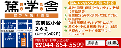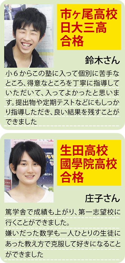 生徒1人ひとりにあわせた指導で定評のある宮前平駅前『篤学舎』。学校の成績が大きな比重を占める近年の入試対策はもちろん、基礎をしっかりと身につける丁寧な個別指導が特長だ。5教科すべてに対応するプロの専任講師。いつでも気軽に質問できる雰囲気も同学習塾ならでは。この春合格した生徒からも「篤学舎に入って良かった」の声が聞かれる。