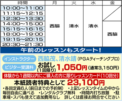 価格は、通常3150円が、お試し1回1050円。クラブレンタルも含めて追加費用は無し。「まったくの未経験者でも気軽に始められる」と評判だ。