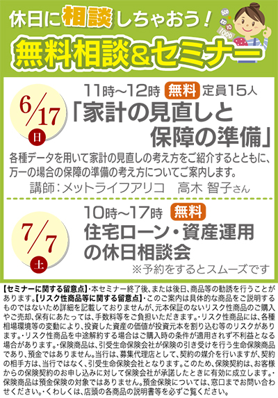 近々では6月17日(日)、「家計の見直しと保障の準備」をテーマにセミナーを開催。各種データを用いて家計の見直しを提案。誰でも参加可能。予約制。11時〜正午。