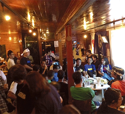 これは、土橋にある「ピザハウス・モッコ」の協力で行われたもの。保護者やOB、関係者らが準決勝で97人、韓国との3位決定戦には65人が集まった。参加者は揃いのクラブTシャツや手製のうちわを持って観戦。在籍していた頃からの「権ちゃん」コールで遠く離れたロンドンへむけて声援を送っていた。11日未明の準決勝戦には、フジテレビの情報番組「めざましテレビ」の撮影も行われた。
