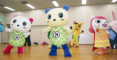 参加しているのは高校生から40代までの市民12人。講座では宮前区30周年のイメージキャラ「宮前兄妹」はじめ、市消費者行政センターのマスコット「てるみ〜にゃ」、自殺対策推進キャラ「うさっぴー」などの着ぐるみが集結。講座は11月25日までで、18日に等々力緑地で行われる多摩川マラソンでのステージと、25日に同館で開かれる「みやまえ文化魂」に参加して区30周年記念ソング「ラッキーフラワー」に合わせてダンスを披露する予定。