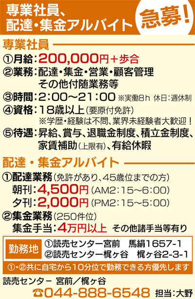 「みんな楽しそうに仕事しています」と話すのは現在スタッフを募集している読売センター宮前の大野店長。なぜなら市民が情報源として大切にする新聞を家庭に届ける仕事に誇りをもって臨んでいるからだ。だからこそ仕事が「楽しい」。