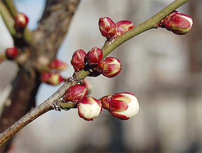 有馬6丁目の梅林公園(有馬6の1の1)の梅が蕾をふくらませている。