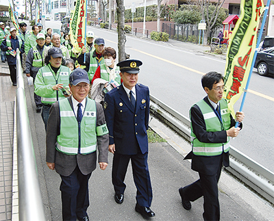 当日は、両区の防犯団体や近隣の自治会・町内会、PTA、区役所、警察署など防犯関係者ら150人が参加。JAセレサ梶ヶ谷ビルでの出発式で、宮前区安全安心まちづくり推進協議会の杉田進会長は「区境は行政や住民の監視が手薄になりがちだが、パトロール開始後は重大事件は起きておらず、皆さんの防犯への取り組みが功を奏している」と話し、参加者を激励。手塚睦男宮前防犯協会会長は1日3回の自主防犯パトロールを行っている大塚町内会の事例を紹介した。