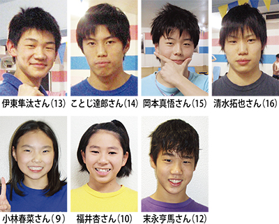 ▼清水拓也(50m平泳ぎ)▼岡本真悟(100m平泳ぎ)▼ことじ達郎(50m・100mバタフライ)▼伊東隼汰(50m自由形)▼末永亨馬(50m・100mバタフライ、50m自由形)▼福井杏(50m平泳ぎ)▼小林春菜(50m平泳ぎ)