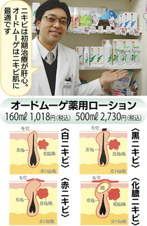 10代から大人までニキビ肌で悩む人に『エーケー有馬薬局』がお勧めしているのが、六陽製薬の薬用ローション『オードムーゲ』。 配合成分が肌をひきしめ、清潔に保つ。年齢・性別問わず余分な皮脂を落とし必要な水分を補う働きがある。大塚嘉之薬剤師は「ニキビは段階によって4つの種類に分けられますが初期段階で適切なお手当てをすることが肝心です。ご相談いただいた方には、4種類のニキビに合ったお手当てをお伝えしています。なかなか改善しにくい方には、漢方薬などの飲み薬もご紹介しています。お気軽にご相談下さい」