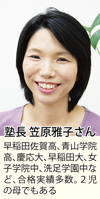 塾長の笠原雅子さん(47歳)は富士見台小学校の卒業生。私立桜蔭中・高校へ進学し、東大法学部へ。卒業後は家庭教師として多数の小・中・高生の受験指導に携わってきた。才媛の印象を受けるが、柔らかな笑顔は2児の母そのもの。子育てと仕事の両立や自宅での学習方法など気軽に相談できそう。笠原さんは保護者との情報共有を大切にしている。子どもの学習状況やその日の宿題内容、気づいた点など細かなことを保護者にメールで報告する。「保護者が子どもを理解していれば、見守ったり励ましてあげたりできます。子どもは安心すると自然と学習に取り組めるようになります」と笠原さん。家庭教師の指導レベルを塾料金で学べる同塾でこの夏子どもを成長させてみては。