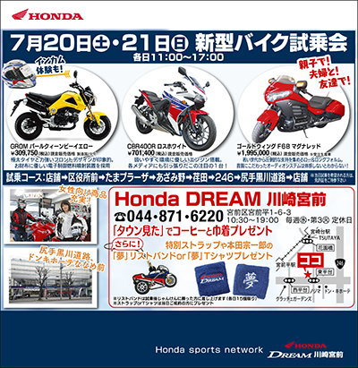 ホンダ二輪車専門の正規販売店『ホンダドリーム川崎宮前』(区内宮前平)が新型バイクの試乗会を7月20日(土)・21日(日)、開催する。試乗車は「グロム」、「CBR400R」、「GL1800F6B」等数機種を予定。いずれも人気商品で常に品薄状態。「一度に試乗できることは少ないのでは」と今泉和俊店長。