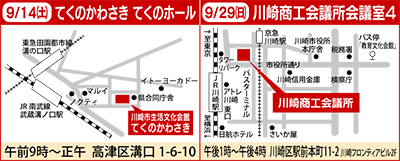 会場は、14日(土)がてくのかわさきで午前9時から正午。29日(日)が川崎商工会議所会議室4(川崎フロンティアビル2階)で午後1時から4時。