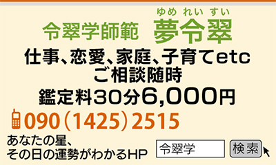 夢令翠─未来はわからないことだらけで不安に思うことも多いと思います。でも地球が24時間で回っていたり、心臓は一定のリズムで鼓動するなどあらゆるものは一定のリズムを刻んでいます。そういった全ての物事の周期や関係性を分析することでよりよい人生に活かす学問が令翠学です。私はその中で明るく人生を歩いていただくために背中をそっと押すアドバイスをしております。令翠学では生年月日で大きく12種類の星に分けております。自分の星の運気をしっかり認識することでよい運気を広げることが可能です。