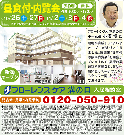 11月1日(金)より新築の住宅型有料老人ホーム「フローレンスケア溝の口」がオープン。現在入居者を募集している。
