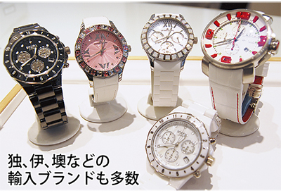 店内には1万円代の特価商品から高級腕時計まで、常時300点以上がずらりと並ぶ。時計ベルトは国内外のブランドを含めて常時500点を2千円代から販売。革、チェーン、ラバー等、種類、色ともに豊富に揃っている。宝飾品は貴石、ダイヤモンドを中心に展開。中でも無調色で経年劣化の少ない、純国産真珠「和奏(わかな)」が注目を集めている。