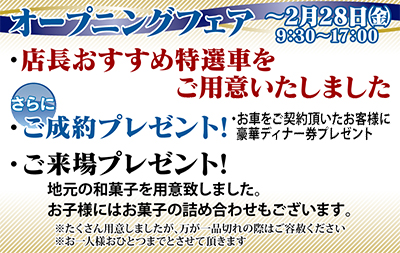 今月28日(金)までのオープニングフェアでは、店長おすすめ特選車が用意され、成約プレゼントもある。さらに来場者を地元の和菓子でもてなしてくれるほか、子どもにはお菓子の詰め合わせをプレゼントしてくれる。