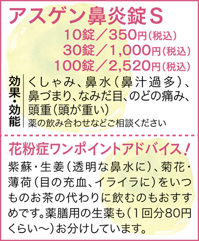 地元宮前区でお馴染みの「エーケー有馬薬局」では、そういう方のための内服薬、『アスゲン鼻炎錠S』をおすすめしている。