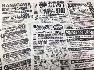 「可能性を信じ」とは、3年前の県議選直前、民主党は「90人」とする条例案を提出、みんなの党は「89人」としていたことがあったからです。しかし両党共、今回『105人』と尻すぼみ。