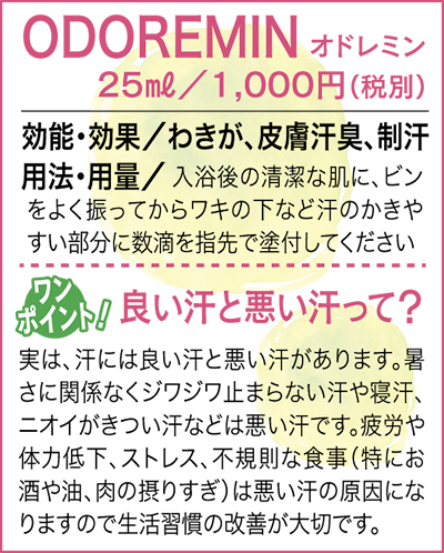 『オドレミン』は口コミで広まった知る人ぞ知る汗止めローション。市販のパウダースプレーとは異なり1回の塗付で、1日中汗やニオイを防いでくれる。お風呂あがりに塗っておけば次の日は1日中快適。何度も塗りなおさなくてよい手軽さも嬉しい。つけ心地もサラッとしてベタつかず、無色無臭で使い勝手も抜群。今年の夏はこれひとつで安心。わきがや足の臭いでお困りの方にもおすすめで男女問わず使用できる。「夏には品切れ状態になってしまうこともありますので早めにお求めください」