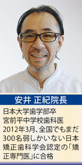 我が子の歯並びについては多くの保護者が気になるところ。悪い歯並び(不正咬合)を放置しておくと、食べ物をよく噛めないばかりか、虫歯や歯槽膿漏の原因にもなりやすく、言葉が明瞭でなくなったり、容姿のコンプレックスにもつながる。一般的な治療開始時期として安井院長は「混合歯列という、乳歯と永久歯が混ざっている状態で始めるのが好ましいでしょう」と話す。成長発育期は歯の動きが比較的速く、歯肉や歯を支える骨等のダメージが少なくてすむほか、永久歯がすべて生え揃う前に始めることで抜歯を避け、治療期間や治療費の負担も軽減する。また、不正咬合の原因が骨格的な問題による場合も上アゴと下アゴの成長時期の違いを利用し、本人の成長にあわせた最適な治療が可能となる。