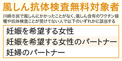 無料検査が受けられるのは川崎市民で、風しんにかかったことがなく、風しん含有のワクチン接種や抗体検査を受けたことがないことを前提に【1】妊娠を希望する女性【2】妊娠を希望する女性のパートナー【3】妊婦のパートナーとなっている。