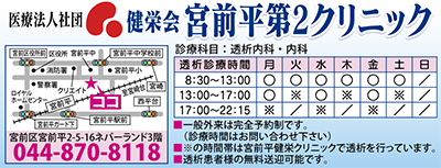 宮前平健栄クリニックの系列医院であり、地域の病院との連携により、日々の透析治療は同クリニックで、精密検査などは大きな連携病院で受けることもできるので心強い。