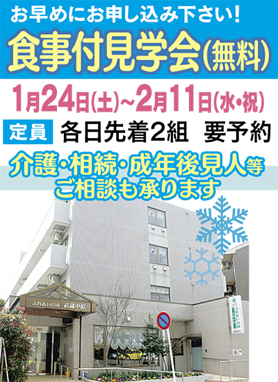 中原区の閑静な住宅街にある介護付有料老人ホーム「ふれあいの園武蔵中原」で1月24日(土)〜2月11日(水)まで、好評の食事付見学会を開催する。現在、参加者を募集中だ。