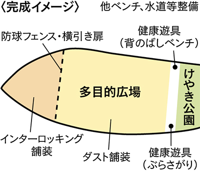 この多目的広場は同公園に隣接した1800平方メートルの公有地をスポーツや地域コミュニケーションの場として利用できるよう整備したもの。ダスト舗装や防球ネットなどを設け、キャッチボールやフットサル、グラウンドゴルフ、健康体操などにも使うことができる。事前に団体登録をすることで、無料で利用可能。事業費はおよそ3328万円。