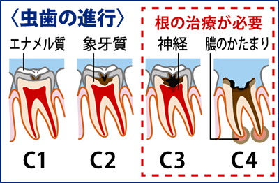 歯科検診でよく耳にする「C1」や「C2」という言葉は虫歯の進行のこと。むし歯が歯の表面のエナメル質や象牙質の部分までであれば、冷たい物や甘いものがしみるという症状が出るが神経治療は必要ない。しかし、これを放置していると「ズキズキと痛む」「噛み合わせると痛い」などの症状で菌が神経に到達してしまったことがわかる。さらに進行すると根の先端に膿ができてしまう。「小さな痛みを見逃さず、早い段階で治療しましょう」