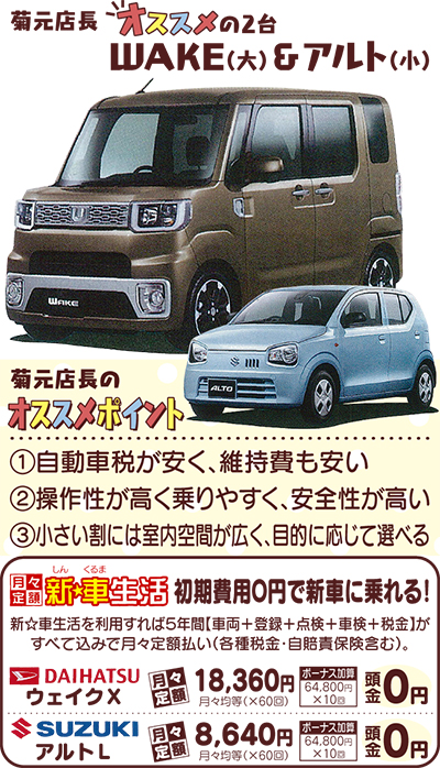 家計にやさしいセカンドカーならダイハツ・スズキの軽自動車がおススメ。しかも最近は、街乗りに最適なクルマから車内広々でアウトドアにも満足な車種までラインナップ充実。CMでおなじみのダイハツ「ウェイク」は自転車2台乗せやキャンプ用品の積み込みもラクラク。また、気軽乗りの定番スズキ「アルト」は低燃費と安定感を備え、乗りやすさナンバー1。他にも豊富な車種から選べる展示場にぜひご来場を。