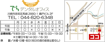 宮前平駅徒歩5分、尻手黒川線沿い西平台信号角にある「でらデンタルオフィス」は、「お客様の立場に立った、安全な歯科医療を提供します」をモットーとした歯科クリニック。