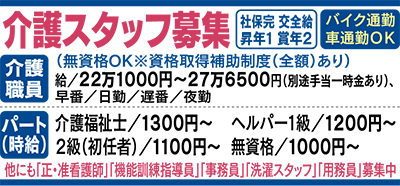 同施設では特養への入居やショートステイ利用に関する相談と同時に、新規スタッフも募集中(下記に詳細あり)。新たにオープンするしがらみのない現場で働きたい人、介護初任者(未資格含む)などに最適の環境が整っている。(問)入居相談…プラチナ・ヴィラ野川開設準備室【電話】044・753・5525、スタッフ募集…グループ採用窓口【フリーダイヤル】0120・975・613