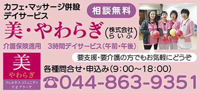 区内犬蔵のサービス付き高齢者住宅ホームステーションらいふたまプラーザ(株式会社らいふ/犬蔵2の12の25)の一角に、新感覚のデイサービス「美・やわらぎ」がこのほどオープンした。オープン1カ月を記念して地域住民に1年の締めくくりを楽しんでもらおうと、12月23日(水・祝)「美・クリスマスの集い」を開催する。午前10時〜午後1時。参加自由。