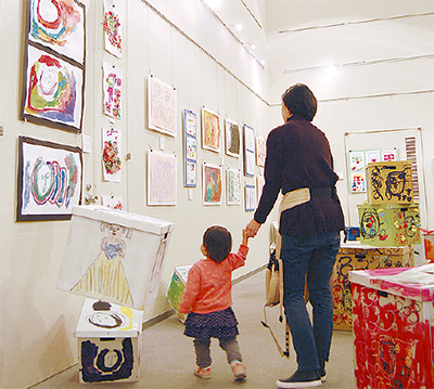 知的障害者支援施設「セルプ宮前こばと」の利用者が画用紙や段ボール箱などに描いた絵など約130点を展示。自作の絵を展示した中村友香さん(36)は「皆に見てもらえて嬉しい」と話していた。