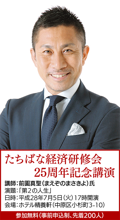 今回の講演は、そんな前園さんの「第2の人生」が演題となっている。開演は午後5時(4時開場)で、参加無料。事前申込制で先着200人、定員になり次第締切となる。
