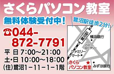 鷺沼駅徒歩2分のみずほ銀行横に「さくらパソコン教室鷺沼校」がオープンした。同教室は「今さらパソコンのことを身内に聞けないし、聞いたら下手で喧嘩になる」「スマホやタブレットを持ってはいるが楽しめていない」「会報誌、年賀状、チラシをサクッと作ってヒーローになりたい」等パソコンを知らない、苦手という人に優しい教室。