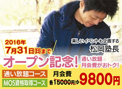 今なら、オープン記念として初心者に嬉しい「通い放題コース」と就職に有利な「MOS資格取得コース」の月会費通常1万5000円が9800円の特別価格に。納得するまで何度でも通えるのにこの価格は驚き。