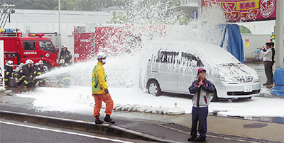 危険物安全週間に伴い宮前消防署は、Dr・Drive初山SSで9日に株式会社アセントと合同でガソリンスタンド火災の消火訓練を実施した。今回の訓練の想定は、スタンド利用者が誤って漏らしたガソリンに着火、車両まで延焼したというもの。GSスタッフが、迅速な通報と初期消火を行い、それを受け危険物火災で使用する泡消火剤を用いて消火の一連の手順や周辺への影響を確認した。