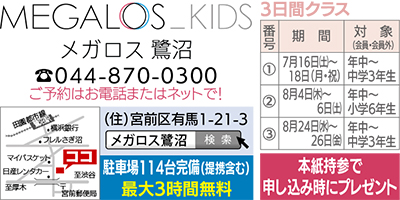 キッズスイミングメガロス鷺沼の夏休み短期水泳教室の受付が始まった。毎年恒例のこの教室は、キッズスクールで培った「ほめて伸ばす」指導で子ども達が楽しみながら成長が実感できると大人気だ。対象は3歳から中学3年生で、水になれていない、苦手といった子どもでも楽しさを知ることでグングン成長できるという。