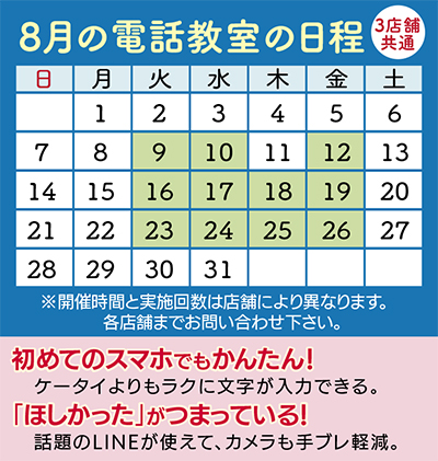 8月の教室参加者には、ジュースをプレゼントする他、購入時に利用できる優待券の特典もあり!(詳細は各店舗にお問い合わせを)。思い切ってスマホにチャレンジしてみては。