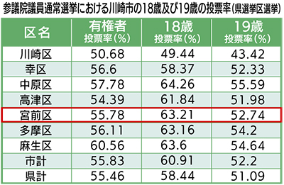 区別にみると、両年齢とも中原区がトップで川崎区が一番低く、宮前区は、18歳で3番目となる63・21%。19歳では4番目となる52・74%だが、いずれも各年齢の投票率は上回っている。