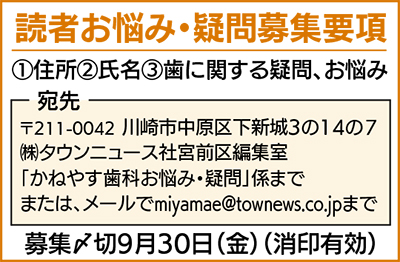 募集内容は、【1】住所【2】氏名【3】歯に関する疑問、お悩み。応募方法はハガキで〒211-0042川崎市中原区下新城3の14の7(株)タウンニュース社宮前区編集室「かねやす歯科お悩み・疑問」係まで。