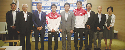 水球男子リオ五輪代表の宮前区ゆかりの選手が12日、福田紀彦川崎市長を表敬訪問した。訪れたのは(株)プラザハウス(鷺沼)所属の荒井陸選手(高津区出身)と東京ガスエスネット(株)所属の飯田純士選手(野川在住)の2人と会社関係者ら。