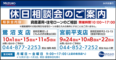 宮前区内のみずほ銀行鷺沼支店と宮前平支店では毎月2回(表参照)住宅ローンについて相談できる休日相談会を開催している。