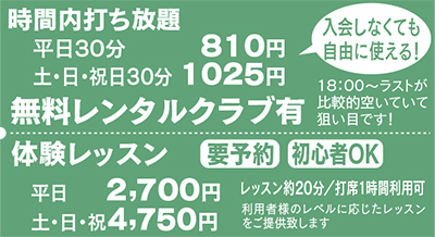 19打席50ヤード(1・2階あり)と本格的な充実の施設を平日は30分810円とお手頃価格で利用できるのは嬉しい限り。