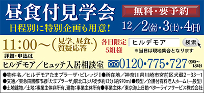 「『本物の』終の住処」として最期まで豊かな暮らしを提供する東京海上グループの介護付有料老人ホーム「ヒルデモアたまプラーザ・ビレッジI」。同ホームでは16周年を記念して「食事付無料見学会」を12月2日(金)、3日(土)、4日(日)の3日間で開催する。各日限定5組。午前11時から。
