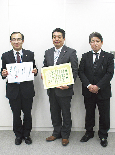 毎年区内の福祉施設にクリスマスケーキを寄贈している株式会社サニクリーン東京(佐々木純男代表取締役・宮前区犬蔵)の寄贈式が9日、市役所健康福祉局で開かれた。当日は同社の堀定仁さん、若月裕司さんが訪れ、成田哲夫健康福祉局局長に目録を渡し、市からはこの取組に対する感謝状が贈られた。